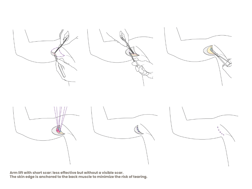 The method with an incision along the inner side of the upper arm is very effective, significantly reducing the circumference of the upper arms and also eliminating wrinkles.