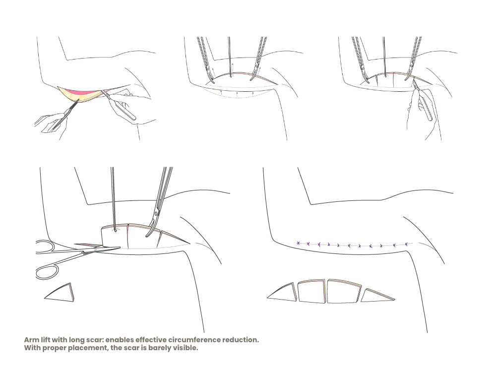 The method using a crescent-shaped incision reduces the circumference of the upper arms only slightly but effectively tightens the skin on the inner side, thereby eliminating wrinkles.