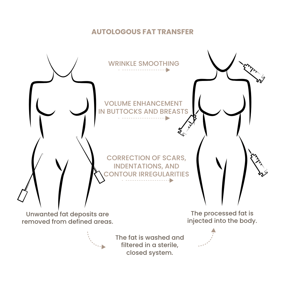 Lipofilling — also known in medical terms as autologous fat transplantation or simply fat grafting — is a technique used in both reconstructive and aesthetic surgery. In this procedure, a patient’s own fat is used to fill wrinkles in the face, refine scars, smooth out dents, add volume to the buttocks or breasts, or improve the shape of various body regions (body contouring).