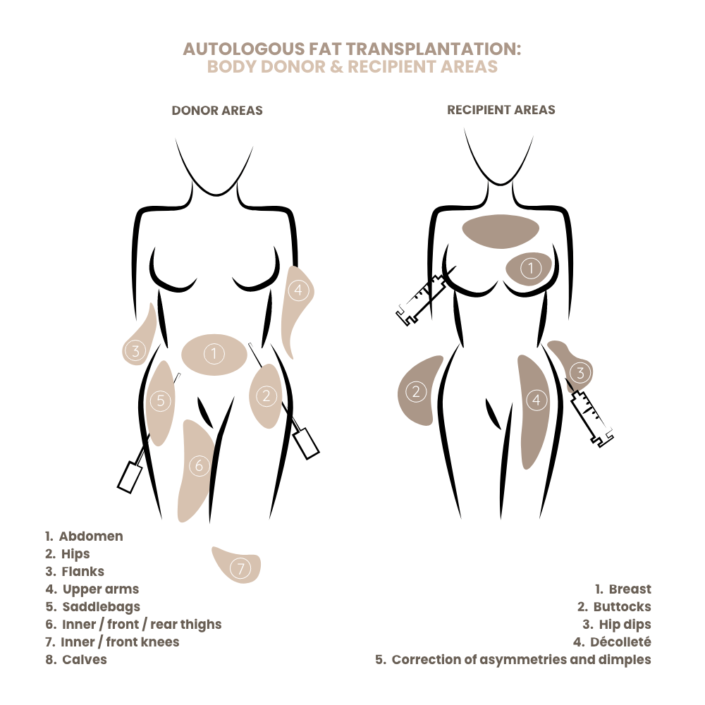 For all large-volume fat transfer procedures (such as breast augmentation, BBL, or body contouring), it’s important to remember that two goals are achieved at once: the donor area (e.g., abdomen, “love handles,” thighs, or arms) is sculpted, while the recipient area gains volume — all within a single procedure.