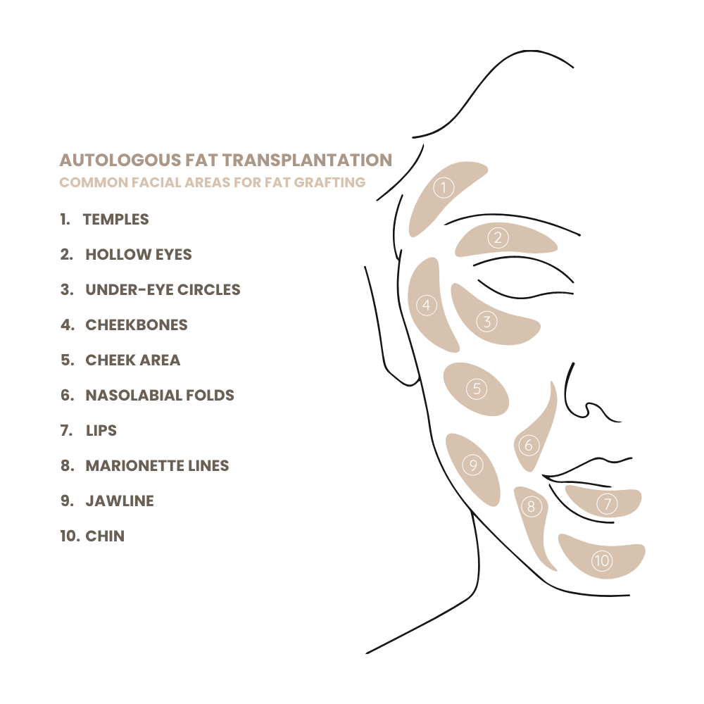 In the face, virtually every region can be refined with experienced technique. The integration rate of fat cells in the face is particularly high, meaning that only one or two sessions are typically required. The most commonly treated areas are under-eye hollows, followed by nasolabial folds and lips (which, due to their constant movement, have the lowest integration rate). Other frequently treated areas include hollow upper eyelids, the cheekbone region, midface, cheeks, and increasingly the temples and jawline, to enhance the definition of the lower face.