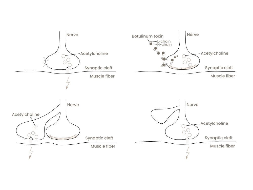 Botulinum toxin (BTX) is a bacterial neurotoxin that blocks the neurotransmitter acetylcholine (ACh). This prevents the transmission of nerve impulses to the muscle, which can then no longer contract. The removal of facial wrinkles with Botox is therefore achieved by relaxing the muscles, preventing the overlying skin from folding into wrinkles.