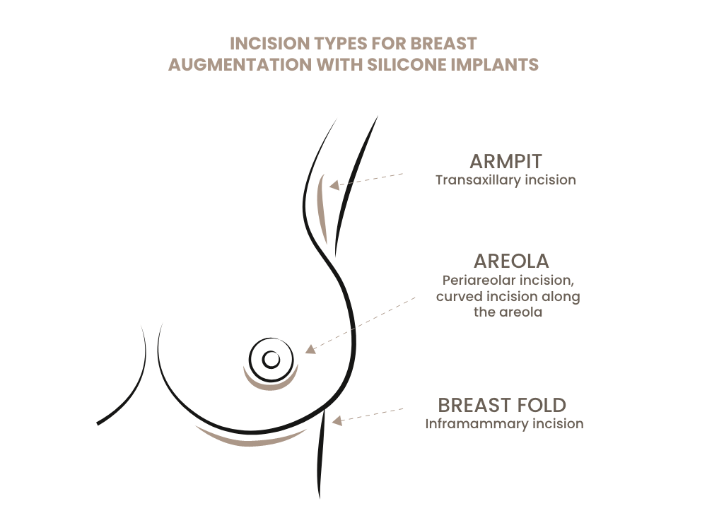 There are three surgical access routes for breast enlargement: armpit, inframammary fold, and areola.