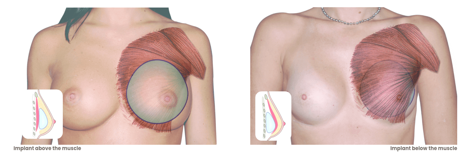 Ideally, implants are placed above the muscle, as this allows them to form a unit with the breast tissue and move naturally with body motion. They are also barely perceptible when healed without complications. To achieve a natural result, however, the implant must be surrounded by a soft-tissue covering. If the volume of a smaller breast is insufficient for this, the implant must be placed under the muscle to ensure sufficient soft-tissue coverage. However, this placement has the disadvantage that the implant moves less naturally and is easier to feel when touched.