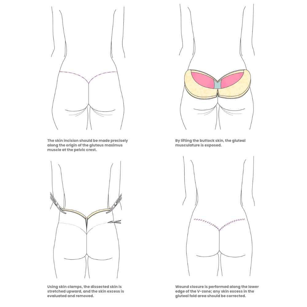 There is only one main method. A V-shaped skin incision is made along the upper edge of the buttocks, the skin is lifted down to the muscle fascia, and the excess skin is pulled upward and removed.