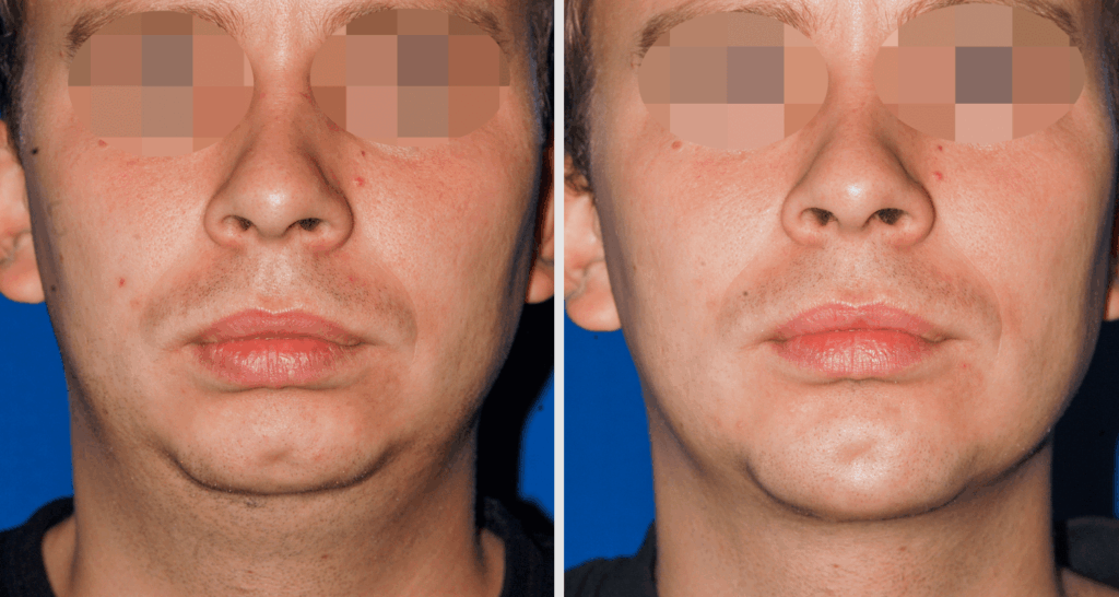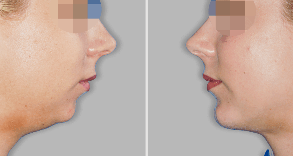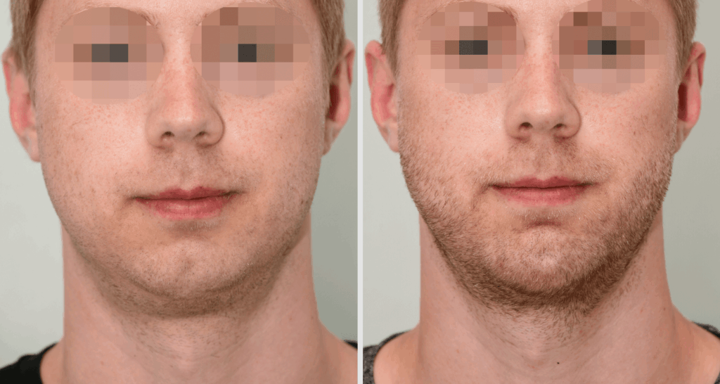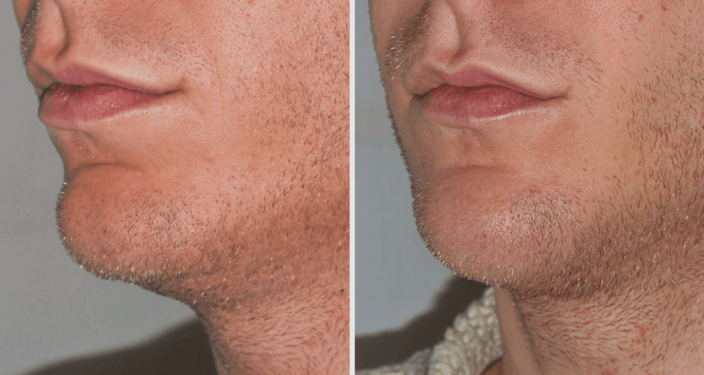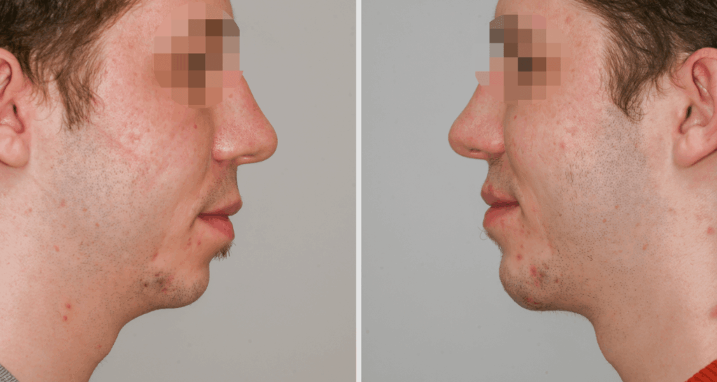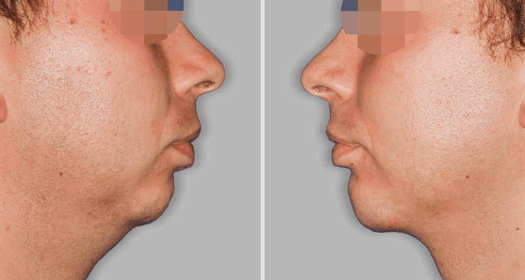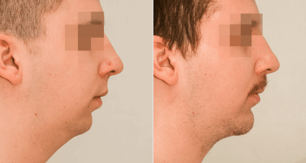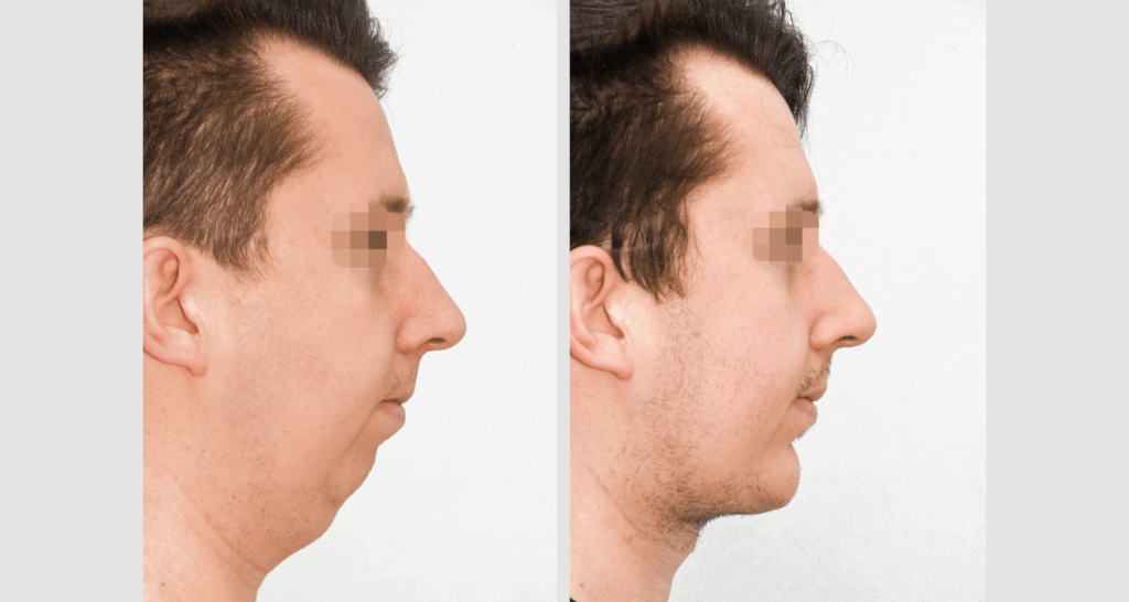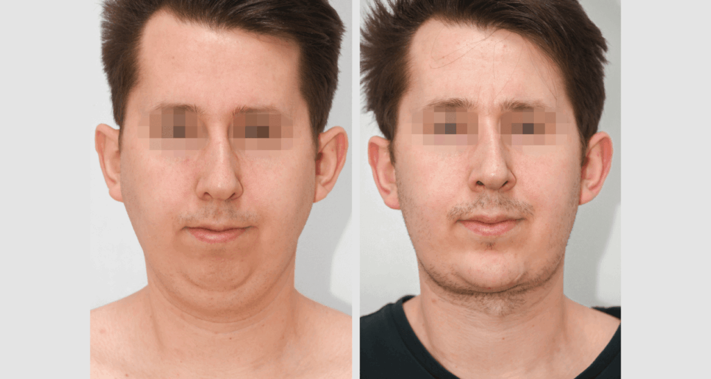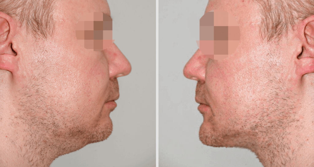 Our before-and-after photos show partially complex chin corrections — from simple augmentations with implants or chin reductions through bone contouring to complementary procedures such as platysma tightening and fat removal to simultaneously correct a double chin. These procedures require extensive experience, as the chin plays a decisive role in facial harmony. The goal is always to achieve a balanced, naturally appearing profile and aesthetically harmonious facial proportions.