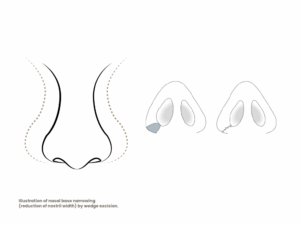 Delicate, slender noses are considered desirable and beautiful — and as long as they fit the face, there’s nothing wrong with that. Sometimes, however, a nose appears simply too wide. In such cases, I can narrow the base of the nose (the nostrils) by repositioning them closer together. The overall shape of the nose remains unchanged.